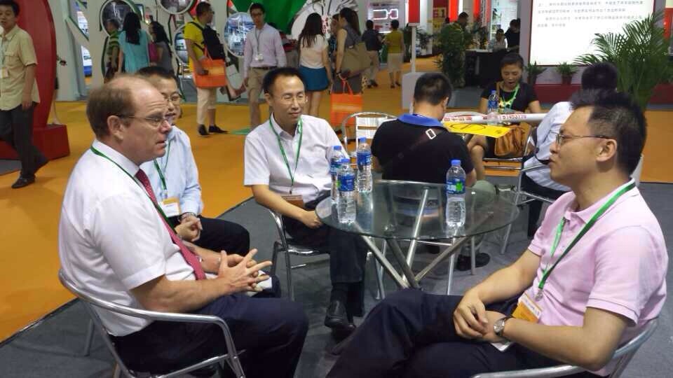 中南傳媒副總經理,湖南天聞印務公司董事長潘曉山(右一),與展廳現場客戶會談