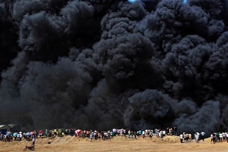 2013年7月2日,長沙瀏陽河黃興大橋附近,兩個復(fù)合地板倉庫起火,火勢借著風(fēng)勢蔓延,冒出的滾滾黑煙,幾乎全城都看得到。華劍回憶,當(dāng)天他剛好從瀏陽出差回來,經(jīng)過高速收費站時看到遠(yuǎn)處濃煙漫天。憑著職業(yè)敏感,他第一時間趕到現(xiàn)場,拍下了這張圖片。