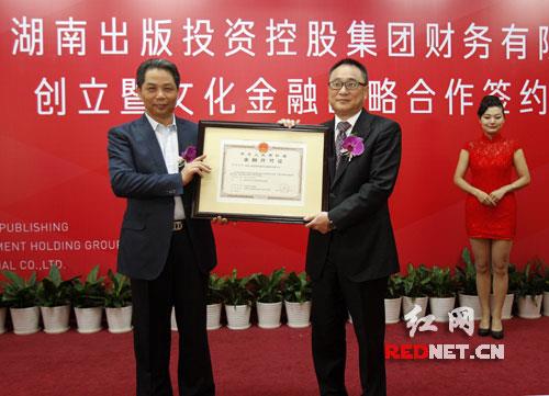 中國銀行監(jiān)督管理委員會湖南監(jiān)管局局長李賽輝向湖南出版投資控股集團財務(wù)有限公司授予金融許可證。
