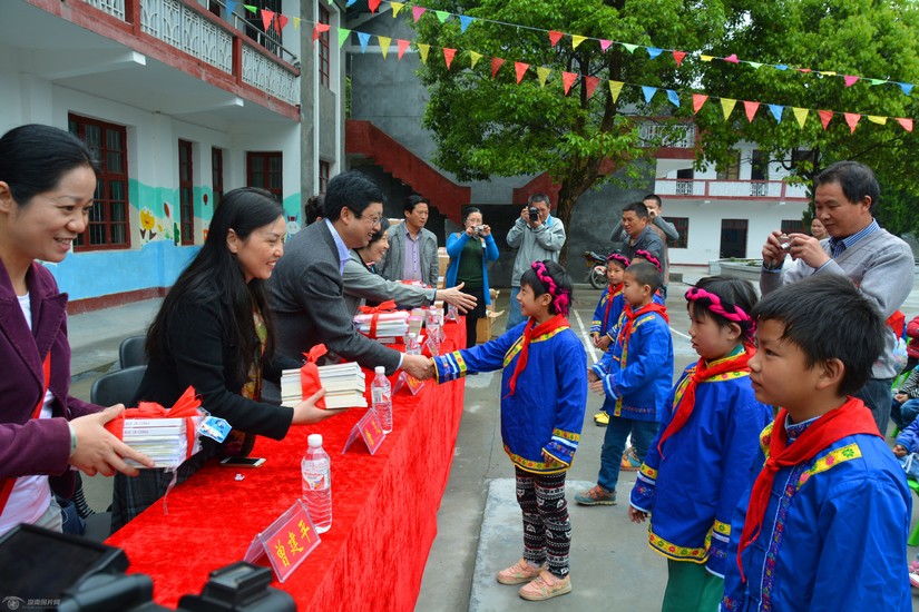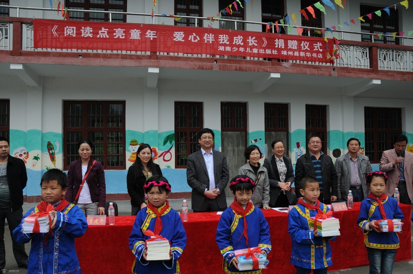 巖灣小學地處靖州最偏遠地區,離縣城60公里,條件非常艱苦,辦公和生活設施落后,同時又是周邊4個村唯一的學校,現有110名學生。2012年8月,珠海市政府干部貝華退休后,義務到這里支教,并積極為孩子們爭取現代教育資源。縣教育局也著力為學校改善辦學條件,將教學樓、食堂改造一新,并建了籃球場和幼兒游樂場,開設了電腦室、圖書室、音樂教室,接收了捐贈校車,提供了免費午餐。但圖書室還是空蕩蕩的,給孩子們留下了一個遺憾。湖南少年兒童出版社了解情況后,募集了700余冊圖書、100套書包及文具、衣物等,派專人送到了學校。